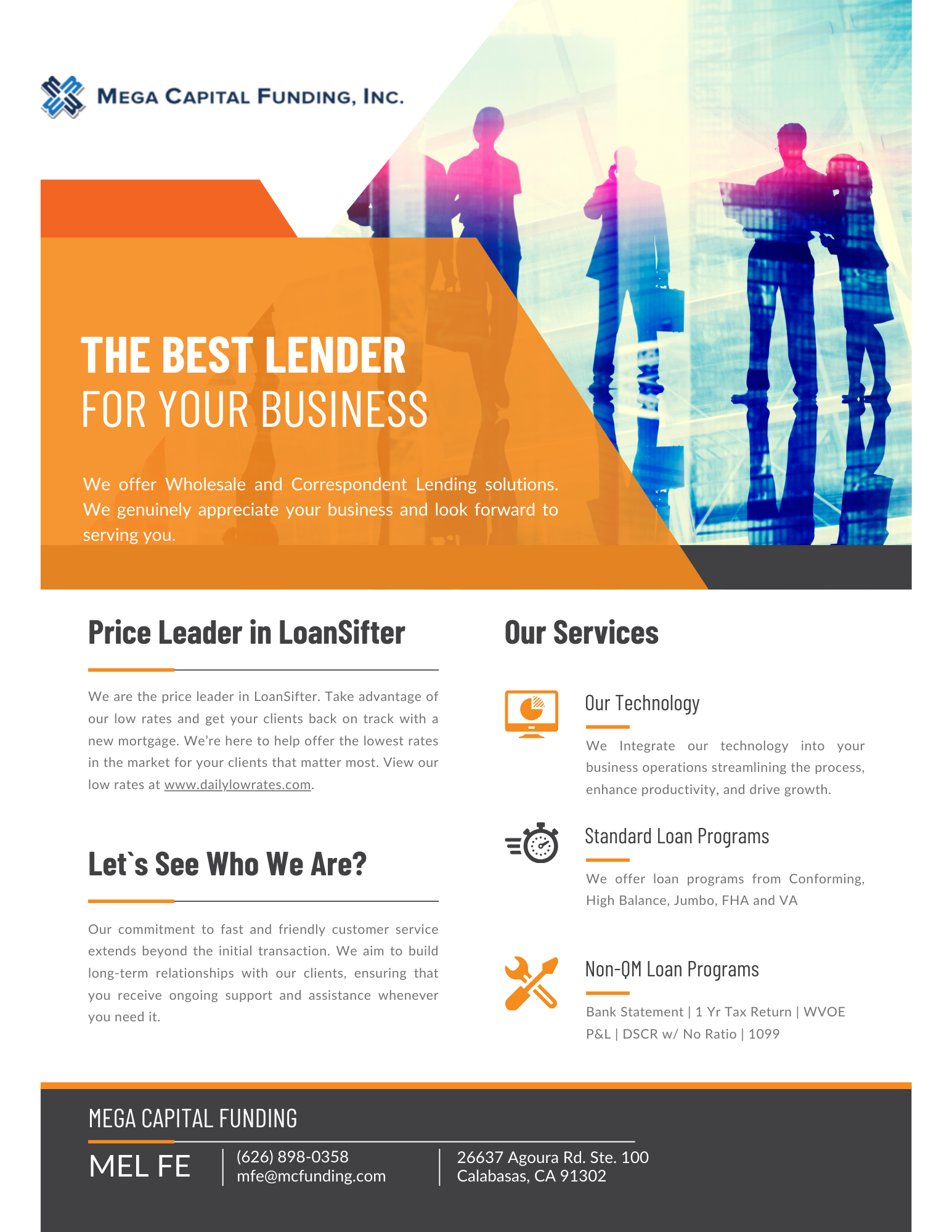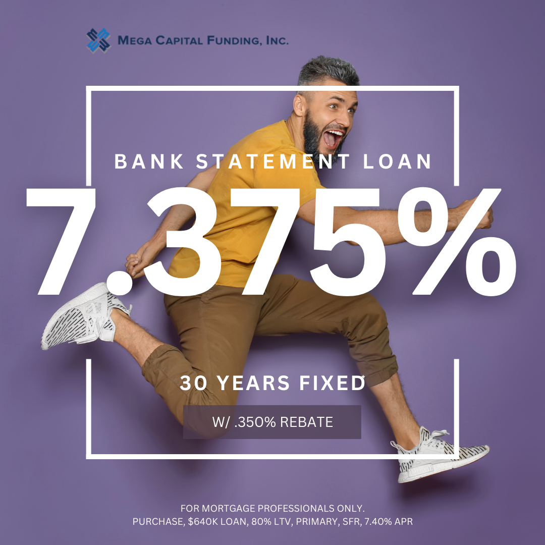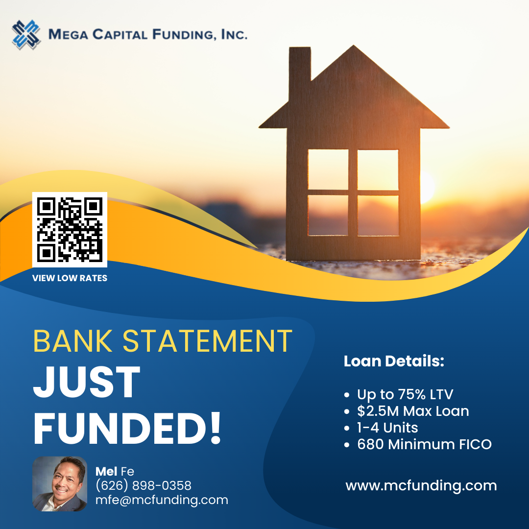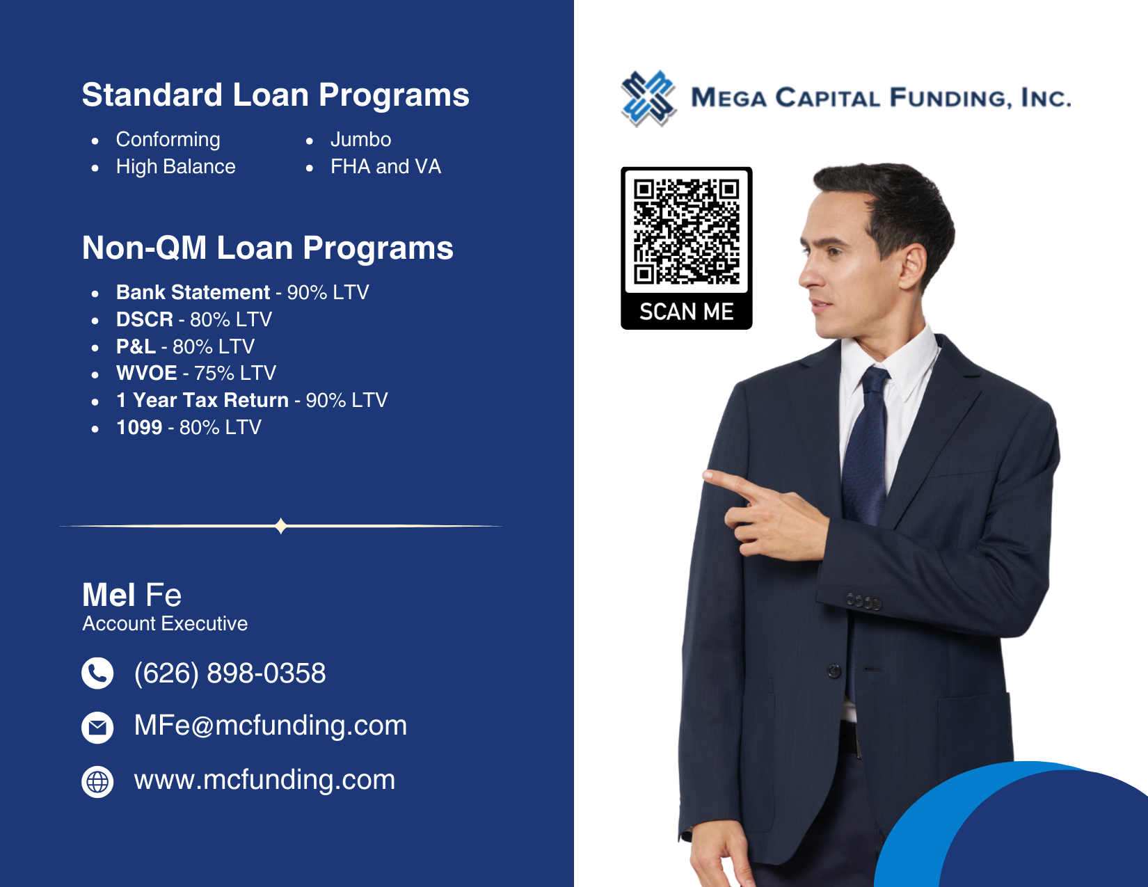 This material is intended for industry professionals only. This is not a solicitation nor a commitment to lend. Restrictions apply. All rights reserved. Some products may not be available in some states. Mega Capital Funding, Inc. Licensed by the California Department of Business Oversight under the California Financing Law License. NMLS #303203, CA-DBO#603-A486, CA-BRE#01233872,WV# ML-303203, Alabama# 23012, AZ #1001176,Arkansas# 125624, DC#MLB303203, Delaware #035860, FL#MLD1274, GA#52995, HI-303203,IL#MB.6761361, MD#22531, OR#ML-5037 TN#303203, VA#MC-6801 WA#CL-303203, TX-SML#303203,Maine #303203 , NJ#B5B5B5,North Dakota MB103886,South Dakota 303203.ML ,OK# MLO14075,Indiana #303203, Iowa# 2021-0186,Idaho #MBL-2080303203,Louisiana #303203, Mississippi# 303203 ,Massachusetts # ML303203, Nebraska# 303203, Michigan# FR0023943, MN-MLO-303203, UT# 303203, Ohio# RM.804784.000, Connecticut# ML-303203,North Carolina # L-205049, New Hampshire# 24475-MB, Rhode Island # 20224334LL, South Carolina# MLS - 303203, Kentucky#MC763986, Kansas# MC.0025740, Wyoming# 4235, Wisconsin#303203BAco registration. NMLS consumer..www.nmlsconsumeraccess.org